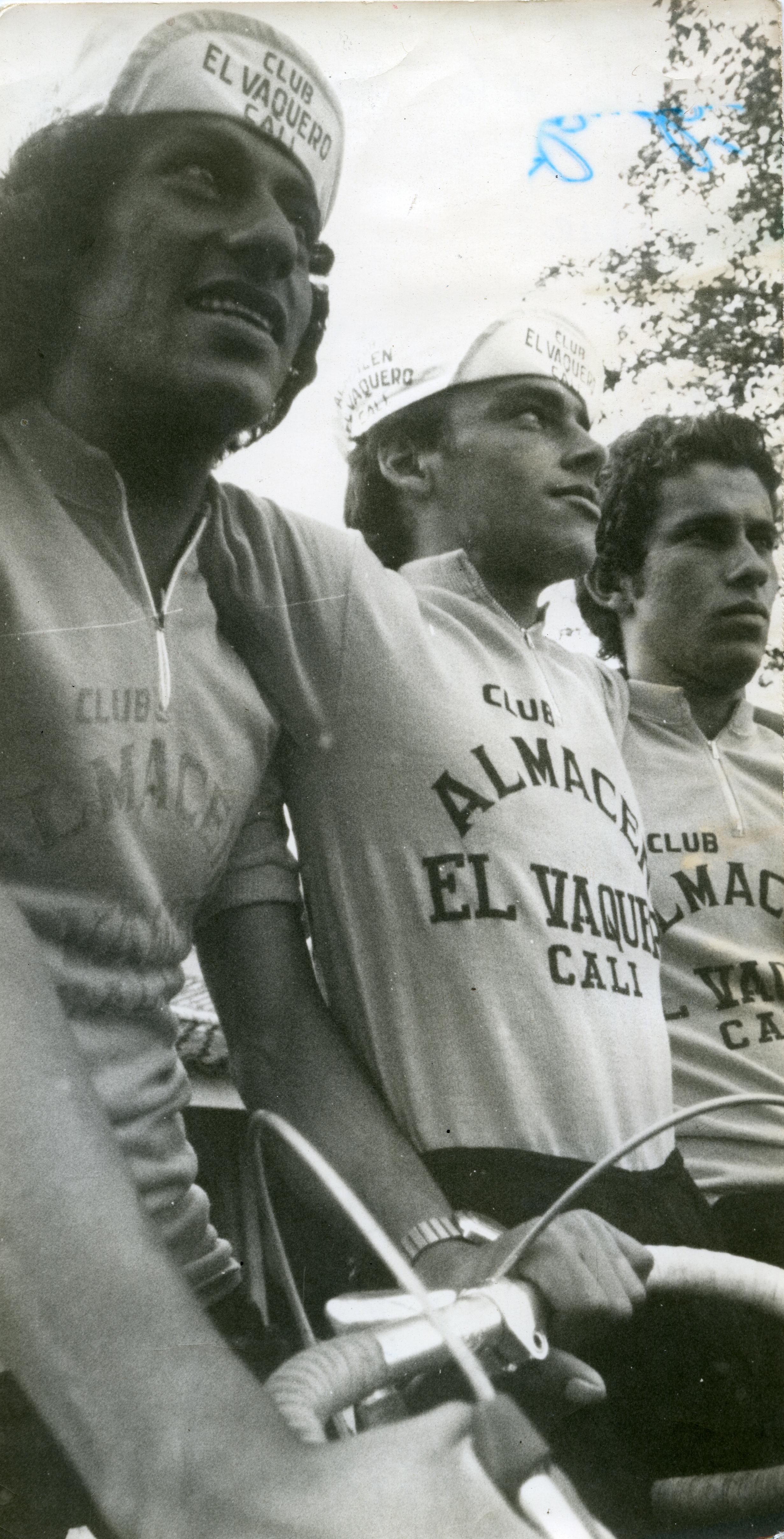Luis Carlos Manrique, nacido el 8 septiembre de 1955 en Onzaga, Santander, Colombia. Es un ciclista Colombiano. En la gráfica se aprecia a Manrique posando para la foto con dos compañeros de equipo. En la camiseta dice: Club Almacén El Vaquero Cali