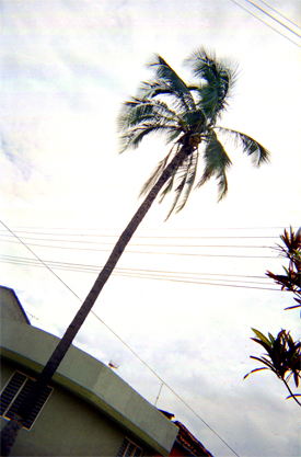 Toma diagonal. Palma en el barrio Bretaña. Por su tamaño se impone en la imagen. Cableado eléctrico generando paralelismo de líneas. Plano general.