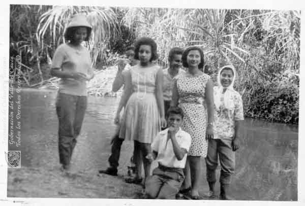 María del Carmen, María Elena, Edelmira, Miriam Larrahondo, Jorge y Laurencio Fuertes, de paseo por las riveras del río Fraile. Candelaria, 1971.