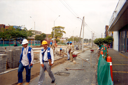 Plano general. Obras del MIO en la carrera primera. En primer plano dos trabajadores caminando, uno mira a cámara. En el plano medio obreros del proyecto. Cercamiento de color verde sostenido por estructuras plásticas de color anaranjado en el lado derecho en primer plano.