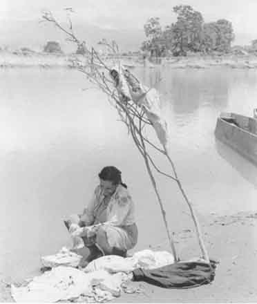 Durante toda la primera mitad del Siglo XX, el río Cali sirvió para que las mujeres vinieran a lavar la ropa de sus hogares en sus orillas y aguas; allí mismo se extendían y ponían a secar al sol, tal como vemos a esta lavandera