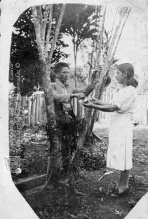 Los patios interiores donde se conservaban árboles frutales, gallineros, hortalizas, plantas medicinales, jardines y pajaros, eran característicos de la mayoría de las casas de nuestros pueblos. Pese a la tremenda arremetida de las construcciones modernas, aún hoy día es posible encontrar algunas casas con este tipo de patios como este en que se encuentran Octavio Arias y María Jesús Orozco en Restrepo. C. 1930.