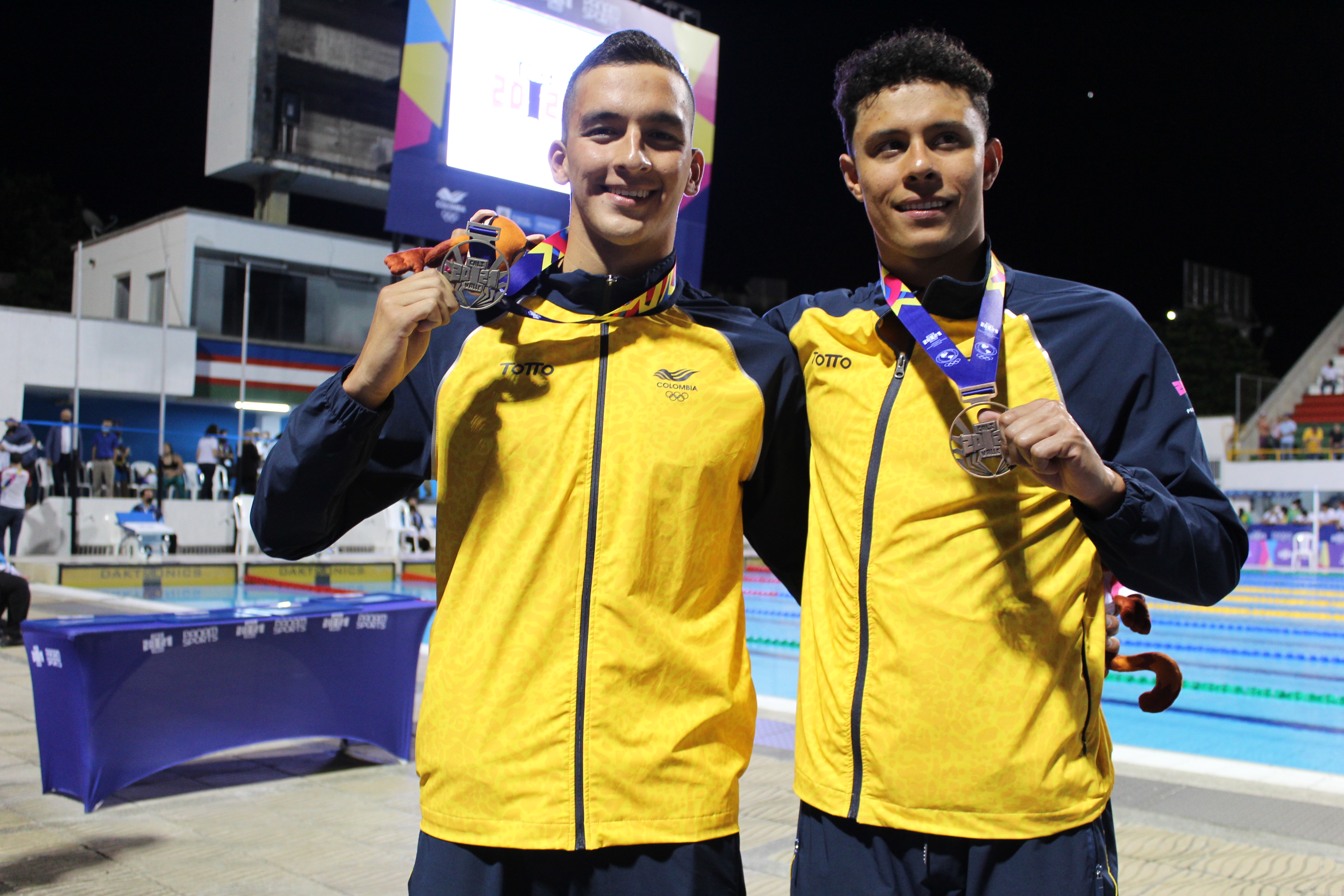En la fotografía podemos observar a los ganadores de la competencia de natación Juan Manuel Morales Restrepo y Santiago Angel Corredor Zabala, quienes participaron en los "I Juegos Panamericanos Junior", llevados a cabo en la ciudad de Cali.