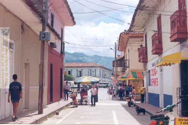 Esquina de la plaza principal vista desde la calle peatonal del Museo Rayo. Roldanillo, C. 1990.