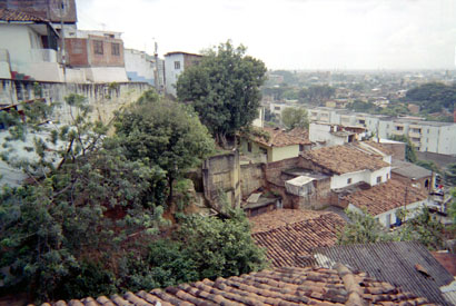 Plano general. Imagen tomada en exterior, donde se puede apreciar varias viviendas con tejados de barro en medio de árboles frondosos. Al fondo la ciudad.