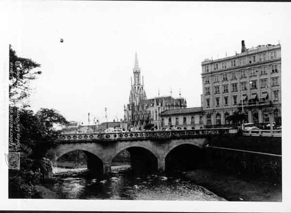 Panorámica del centro de la ciudad. Se aprecia la Ermita, el Hotel Alférez Real y el Puente Ortiz sobre el río Cali. Santiago de Cali, 1. 950