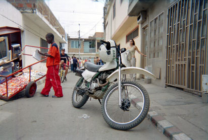 Plano medio. Exterior día. Motocicleta en primer plano. Se aprecia gente en diversas actividades. Resalta vendedor ambulante en costado izquierdo. Calle con perspectiva lineal.