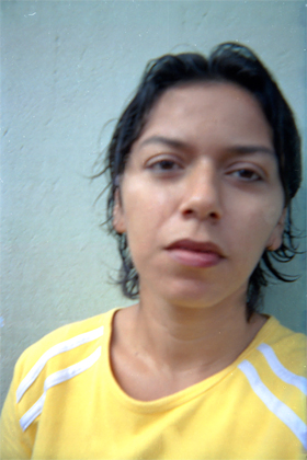 Autorretrato. Primer plano. Se destaca el color amarillo de la camiseta contrastado con el verde de la pared. Cabeza de la autora ligeramente inclinada hacia la derecha.