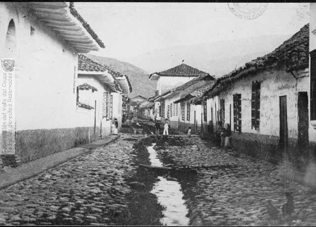 Antigua Calle de Balboa hoy Calle 3 con carrera 14 esquina. La zanja que vemos por la mitad de la calle empedrada, es vestigio de los antiguos sistemas coloniales de servicios públicos para la escorrentia de aguas sucias. Buga, 1880.
