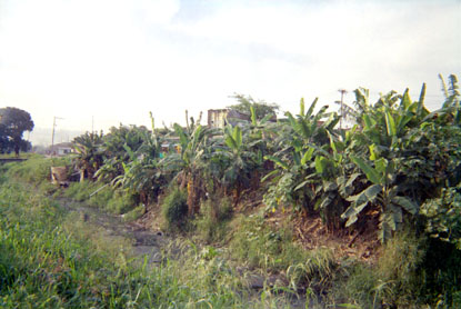 Plano general. Exterior día. Vegetación en bloque inferior, donde predomina platanal y casa en centro superior, en oposición a delgada franja celeste.