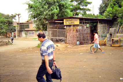 Plano Medio. Se aprecia una vía despavimentada por la que transita un hombre en el extremo inferior. Al fondo en la parte superior una construcción en hierro donde funciona una chatarrería, con un aviso en color amarillo.