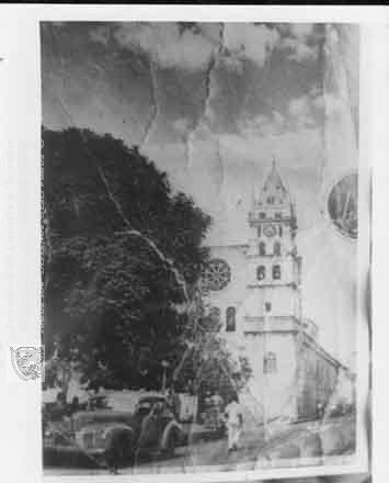Panorámica de la plazuela de Francisco con la torre de la iglesia y los árboles que la engalanan, Cartago, 1936