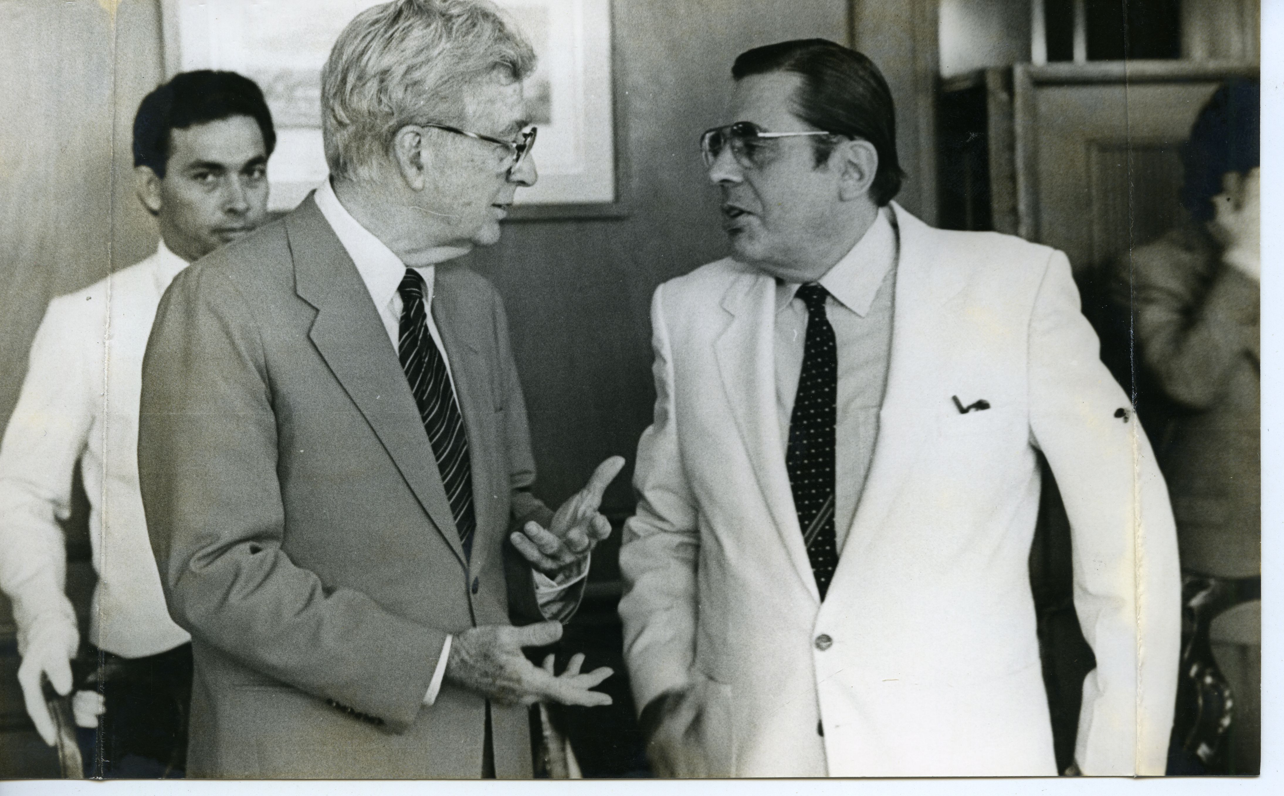 En la fotografía es posible detallar al gobernador Ernesto González Caicedo en compañía con el presidente Virgilio Barco y otro individuo desconocido. La reunión tiene lugar en hall del Club Colombia.