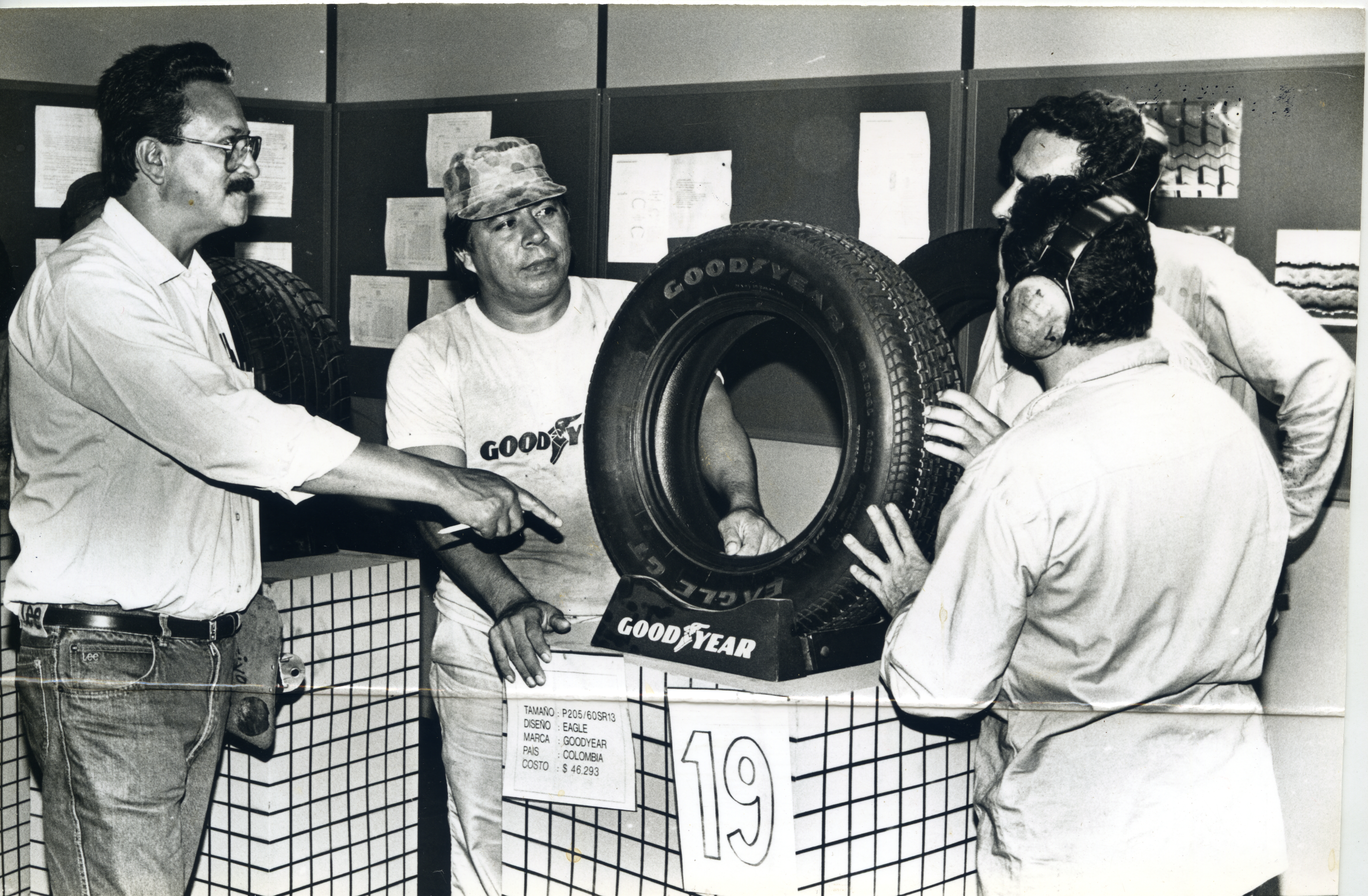 Trabajadores de Goodyear alrededor de una llanta de la empresa diseño "Eagle".