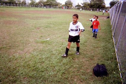 Composición marcada en diagonal ascendente por las rejas de la parte derecha de la imagen. En plano medio y uniformados podemos ver tres niños que hacen parte del equipo.