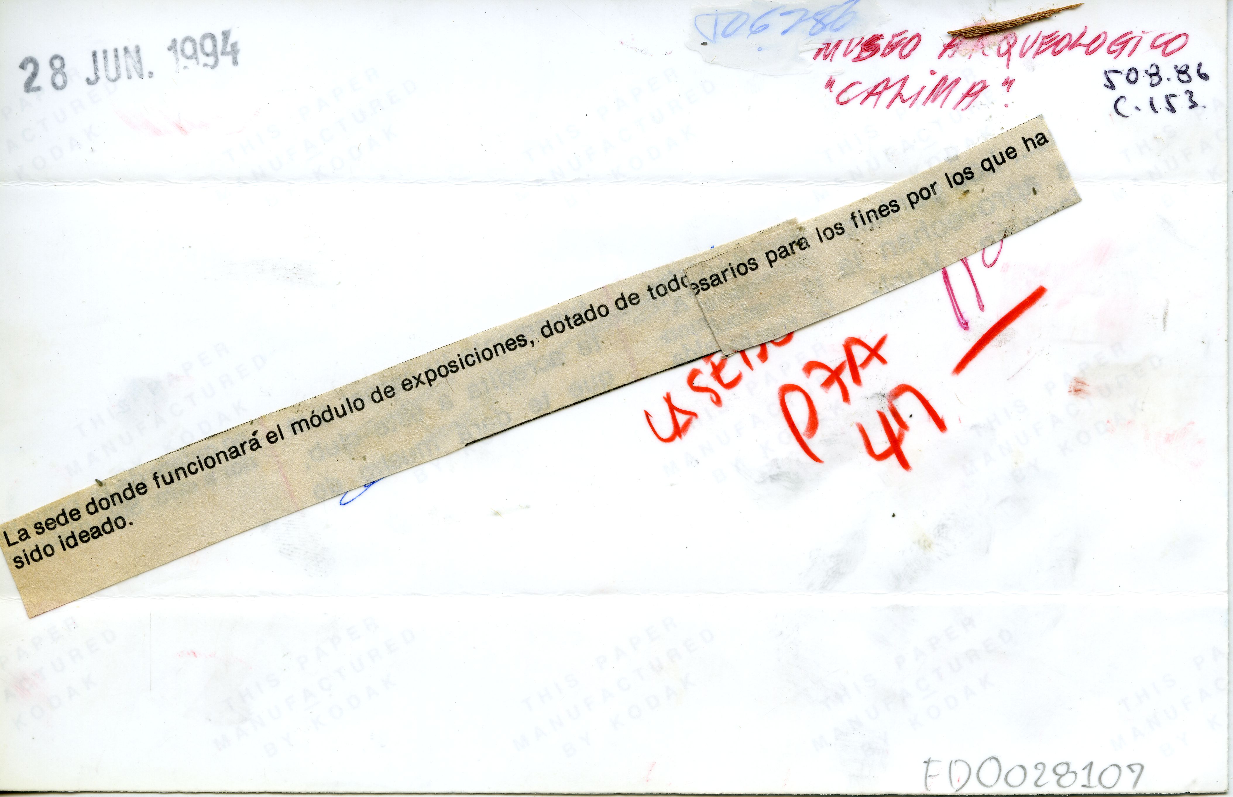 Reverso:"La sede donde funcionará el modulo de exposiciones, dotado de todos los implementos necesarios para los fines por los que ha sido ideado"