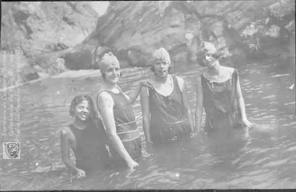 A principios del siglo XX el río Cali contaba con charcos como Los Pedrones, El Burro, la Estaca del Colorado Caicedo y el de La perla, los cuales fueron frecuentados por las familias caleñas. En la fotografía se observa un grupo de mujeres bañándose en uno de los charcos del río, con bañadores que les cubría hasta las rodillas. Santiago de Cali, 1923