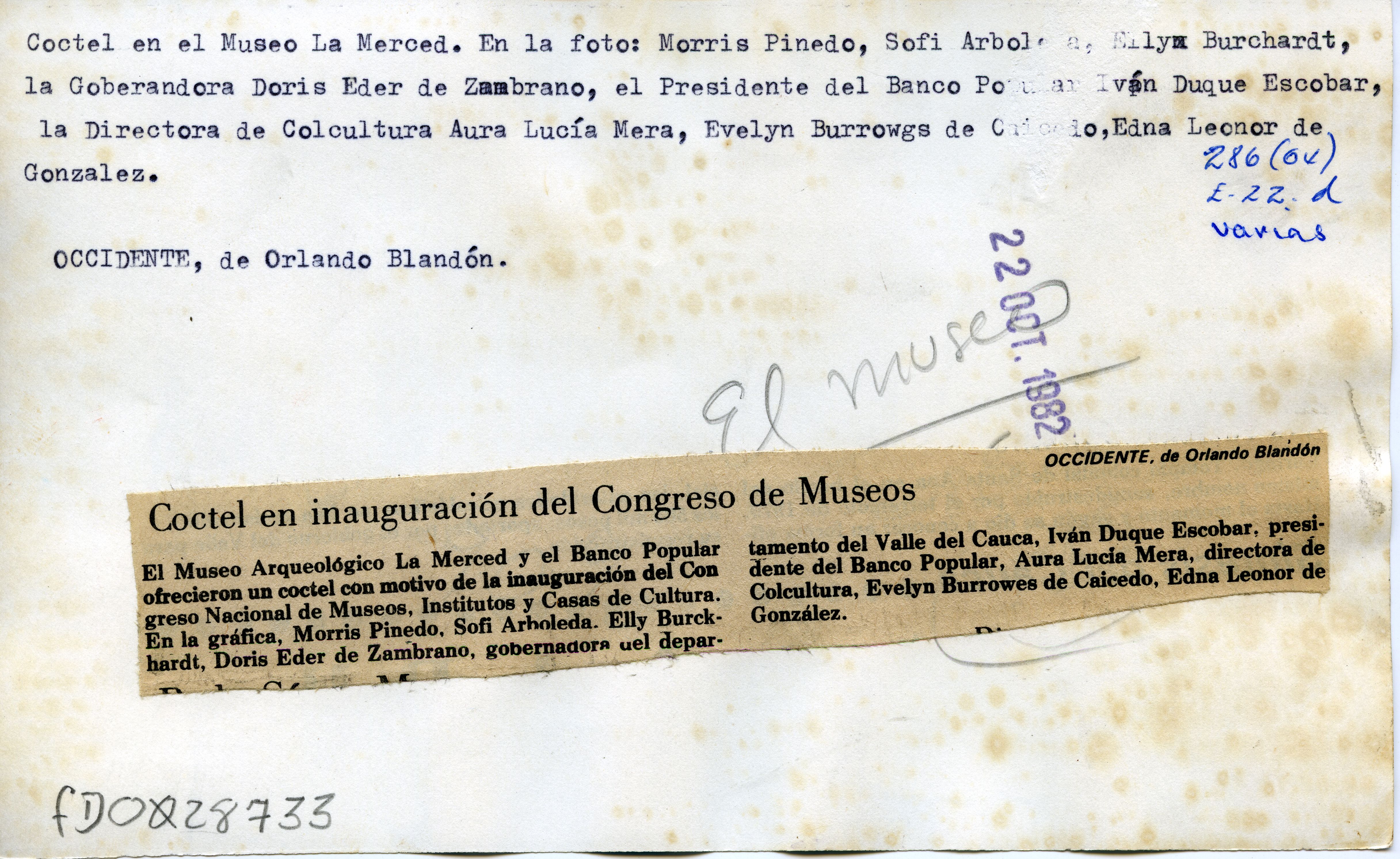 El Museo Arqueológico La Merced y el banco Popular ofrecieron un cóctel con motivo de la inauguración del Congreso nacional de Museos, Institutos y casas de Cultura. En la gráfica, Morris Pinedo, Sofi Arboleda, Elly Burckhardt, Doris eder de Zambrano, gobernadora del departamento del valle del Cauca, Iván Duque Escobar, presidente del Banco Popular, Aura Lucía Mera, directora de Colcultura, Evelyn Burrowes de Caicedo, Edna leonor de González.