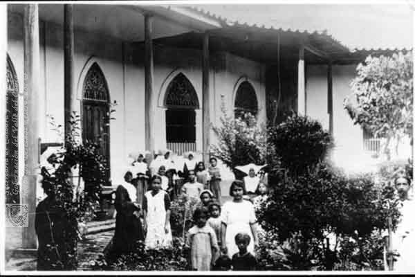 Interior del Hospital, clásica arquitectura colonial, detállese la presencia de arbloes de ramaje abierto, ello sugiere una amplitud en los patios interiores muy característicos de este tipo de construcciones