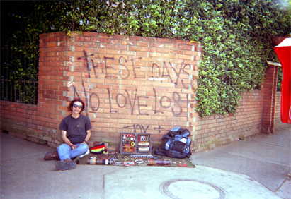 En una esquina de barrio un artesano sentado en la acera mira a cámara. Detrás de él sobresale graffiti. Plano medio.
