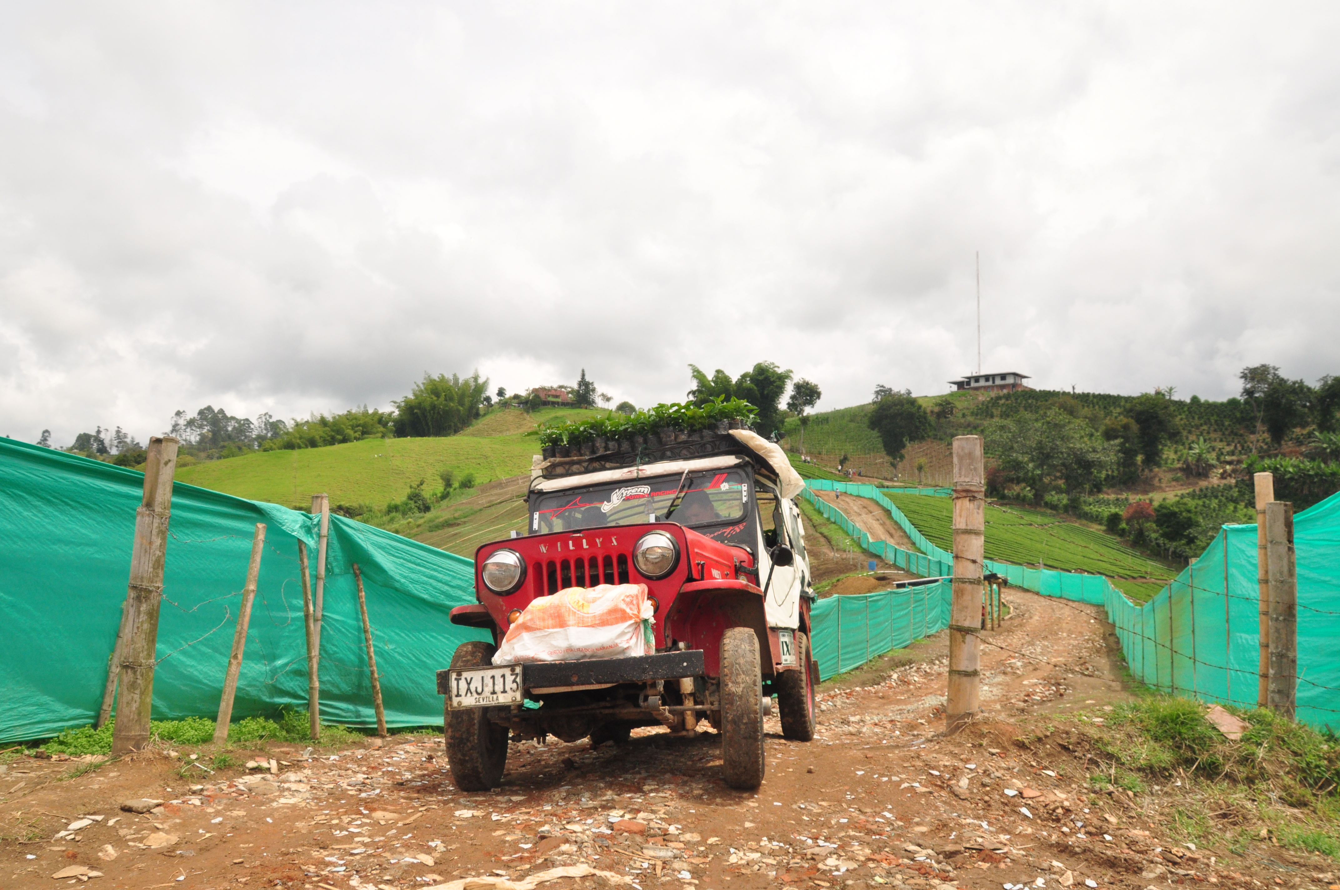 Sevilla, Valle del Cauca. Fundado en 1903, por Eraclio Uribe y Colonos antioqueños y caldenses. Nombres: San Luis. Municipio desde 1914. Economía importante en agricultura, caficultura, ganadería, comercio, minería, entre otros. Atractivo turístico: Basílica San Luis Gonzaga, Café Casablanca, fincas cafeteras. Observamos en la imagen, jeep willys transportando colinos