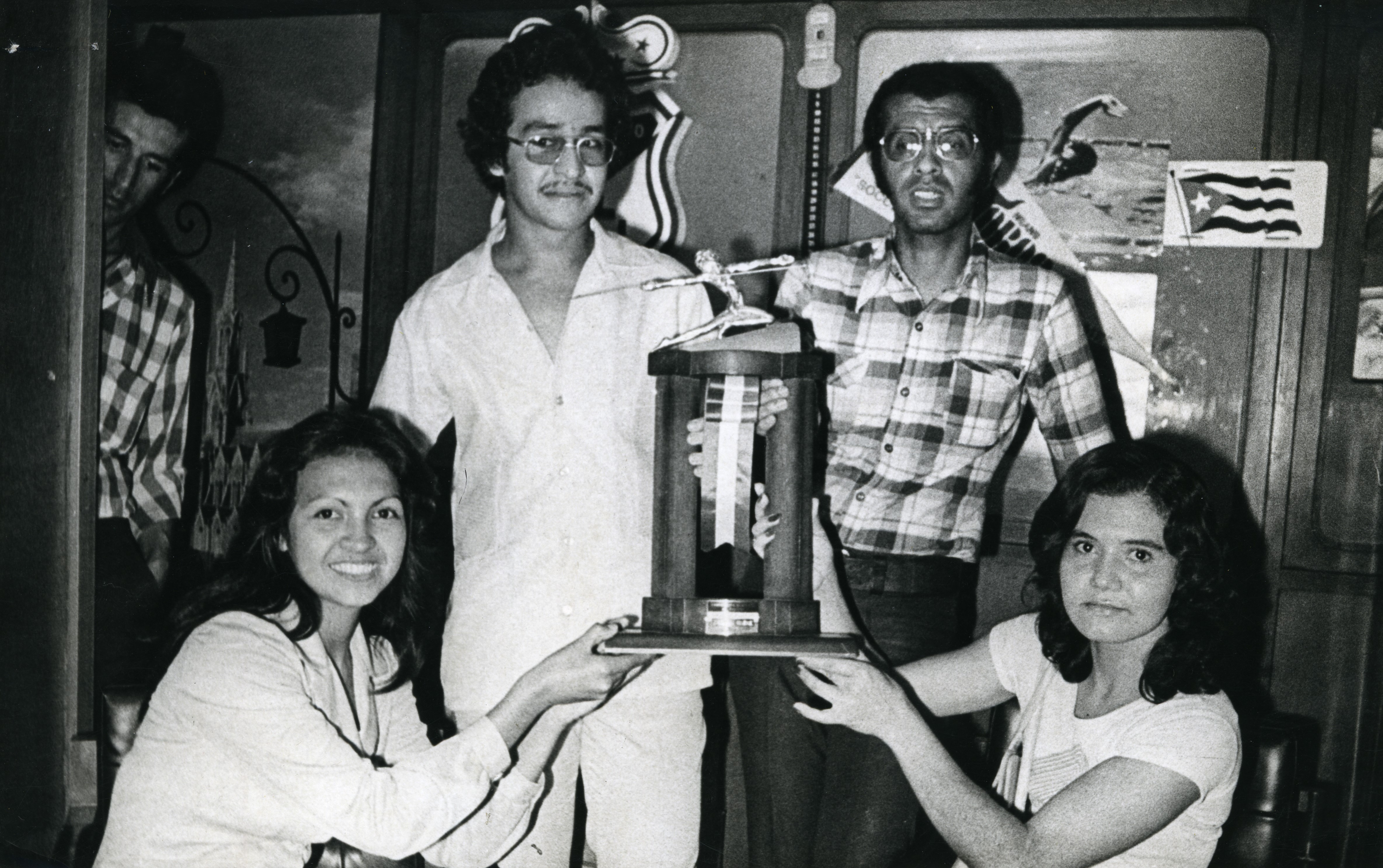 Personas sonríen ante la cámara con trofeo.