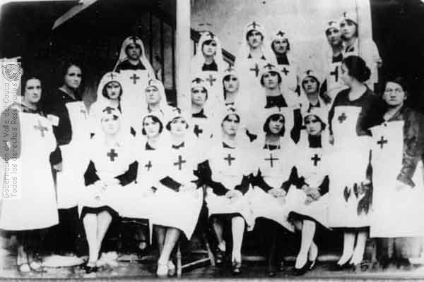Damas del cuerpo de la Cruz Roja de Sevilla. 1932. De izquierda a derecha: Inés Villegas de Villegas, Faustina Mejía de Hoyos, Concha Ceballos, Soledad Rodríguez, Judith Botero, Tulia Ceballos, Celmira Jaramillo, Adelfa Ossa, Mélida Ceballos, Ana Sara Márquez, Aura Hoyos, Graciela -apellido por identificar-.