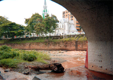 Plano general. Se privilegia la composición arqueada del puente Ortiz, que sirve de marco a iglesia. Perspectiva de torre de Ermita y río Cali en segundo y tercer plano respectivamente. Contraste entre los diversos colores y texturas.