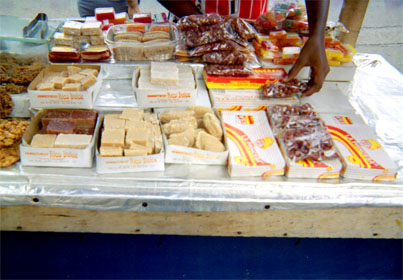 Primer plano. Dulcería. Sobredimensión de escena por encuadre. Escena rica en formas y variedad cromática. Detalle de mano en costado derecho. Borde inferior de mesa fracciona la continuidad de la imagen.