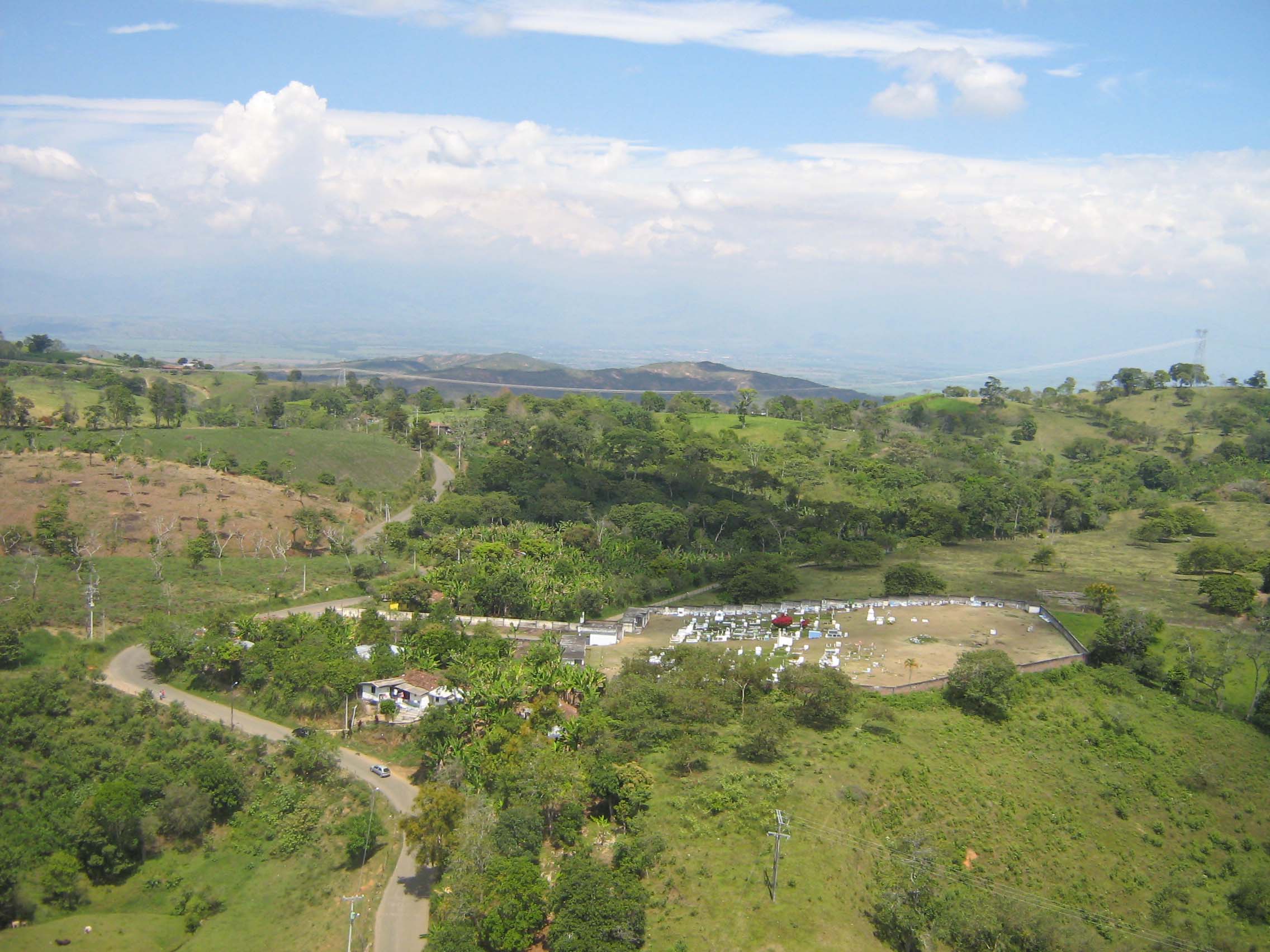 Trujillo, Valle del Cauca. Fundado en 1924, por Leocadio y Rafael Salazar. Nombres: Vernaza. Municipio desde 1930. Economía importante en agricultura, caficultura, ganadería, explotación forestal, entre otros. Atractivo turístico: Iglesias, Charco El Pailón, Monumentos a los Derechos Humanos, Parador El Tablazo. Observamos en la imagen, panorámica vía Riofrío y cementerio central