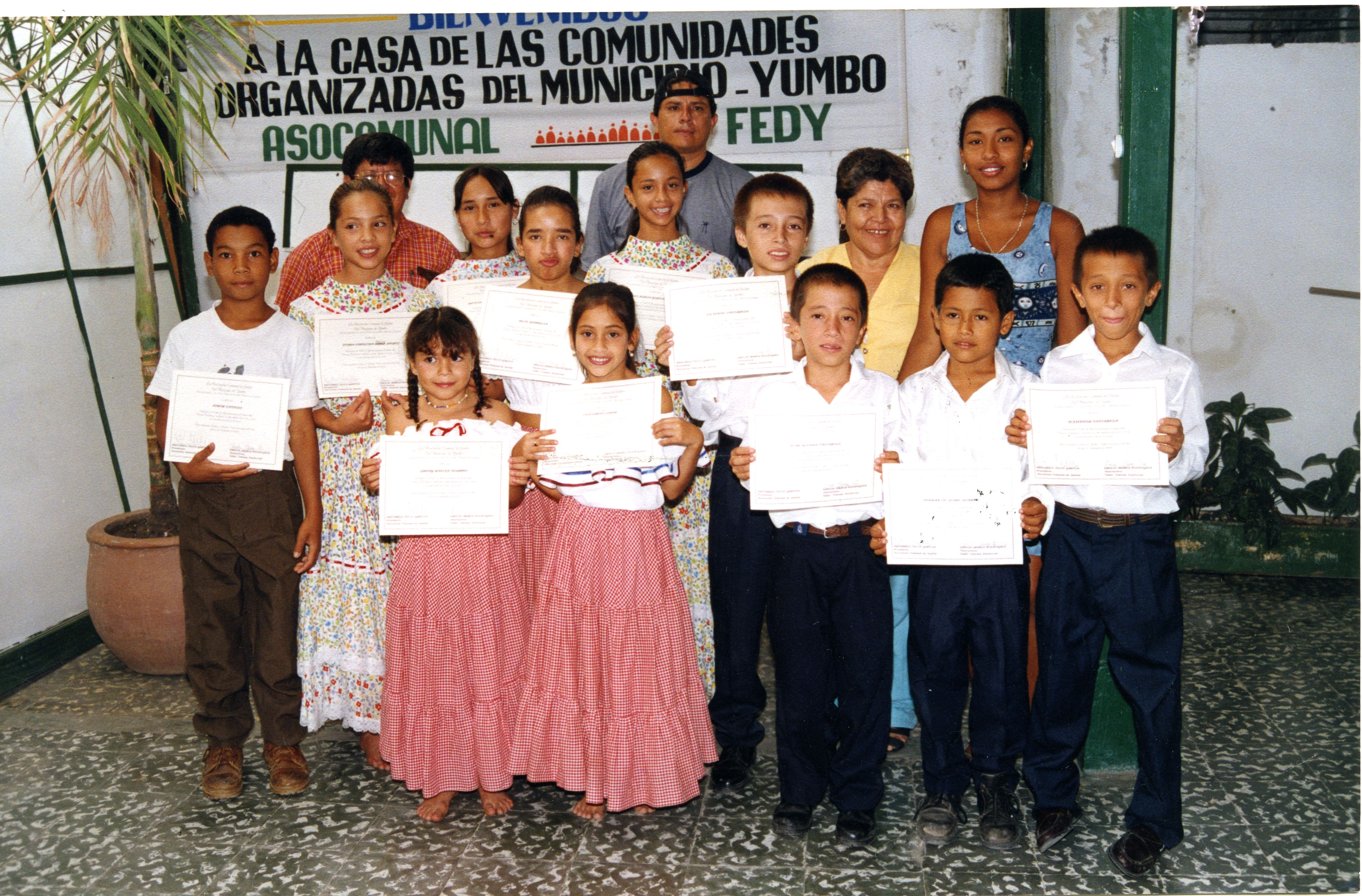 Reverso:"La Casa de las Comunidades Organizadas, fue sede de la capacitación en danzas para los niños amigos de la Asociación Comunal de Juntas Comunales de la Capital Industrial del Valle del Cauca."
