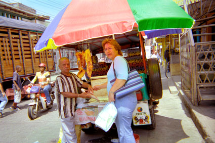 | dc.description | Plano medio. Imagen tomada en exterior, donde se aprecia un hombre y una mujer bajo un parasol de variados colores, en un puesto de venta de carnes, improvisado en un campero. | spa |