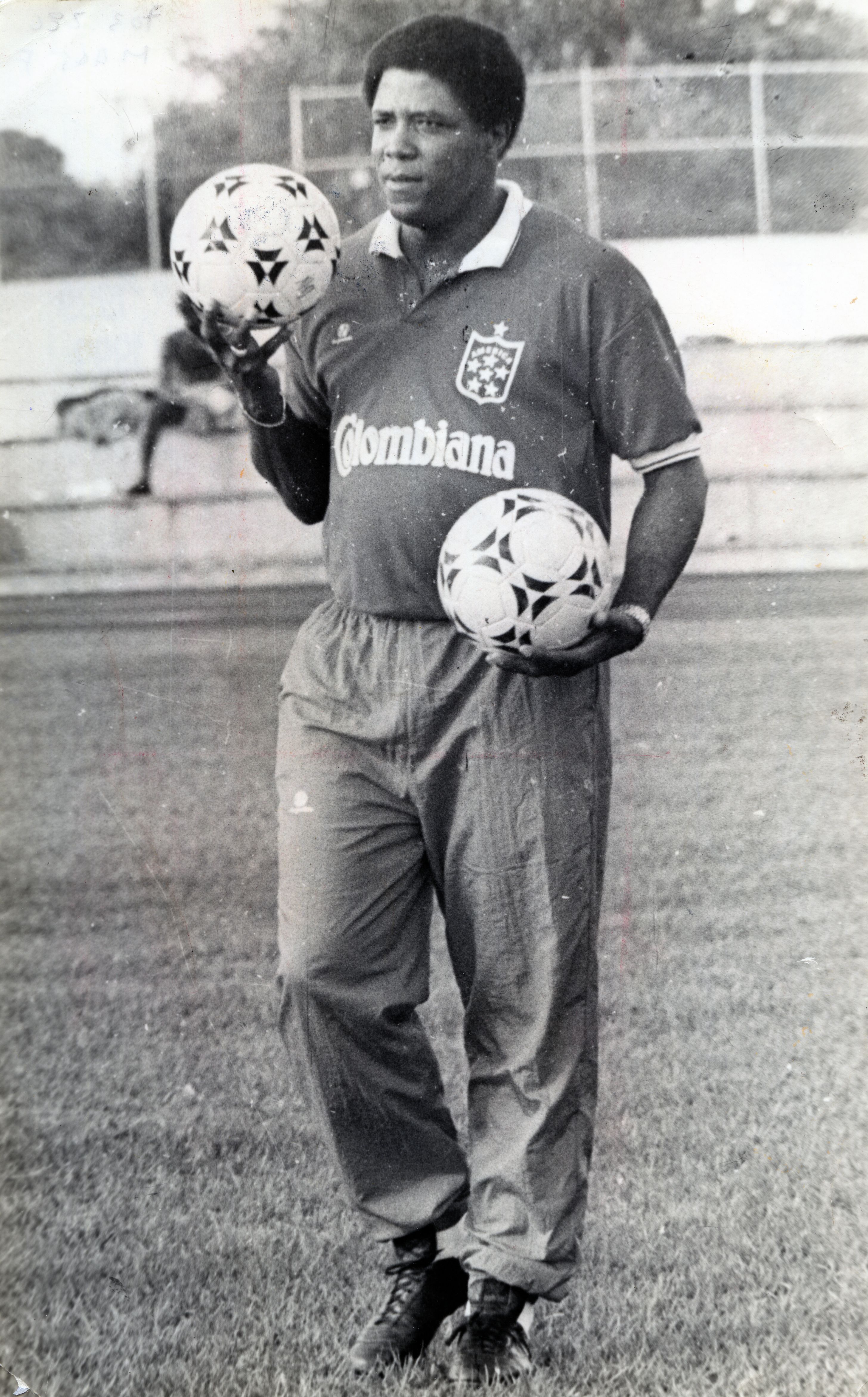 "Francisco Antonio Maturana García nació en Quibdó el 15 de febrero de 1949. Odontólogo, futbolista, asistente, director técnico y miembro de la junta directiva del Club Atlético Nacional. Su carrera como entrenador, comienza en el Once Caldas en 1986. Dirigió los equipos Once Caldas, Atlético Nacional, la selección Colombia, Real Valladolid C. F., América de Cali, Atlético de Madrid, la selección de Ecuador, Millonarios, la selección de Costa Rica, la selección Perú, Al-Hilal Saudi F. C., Colón de Argentina, Gimnasia y Esgrima (LP), la selección de Trinidad y Tobago, Al Nassr, Once Caldas y Royal Pari de Bolivia. En la foto el técnico Maturana con dos balones en la mano, dirigiendo un entrenamiento en Cascajal, la sede deportiva del América."