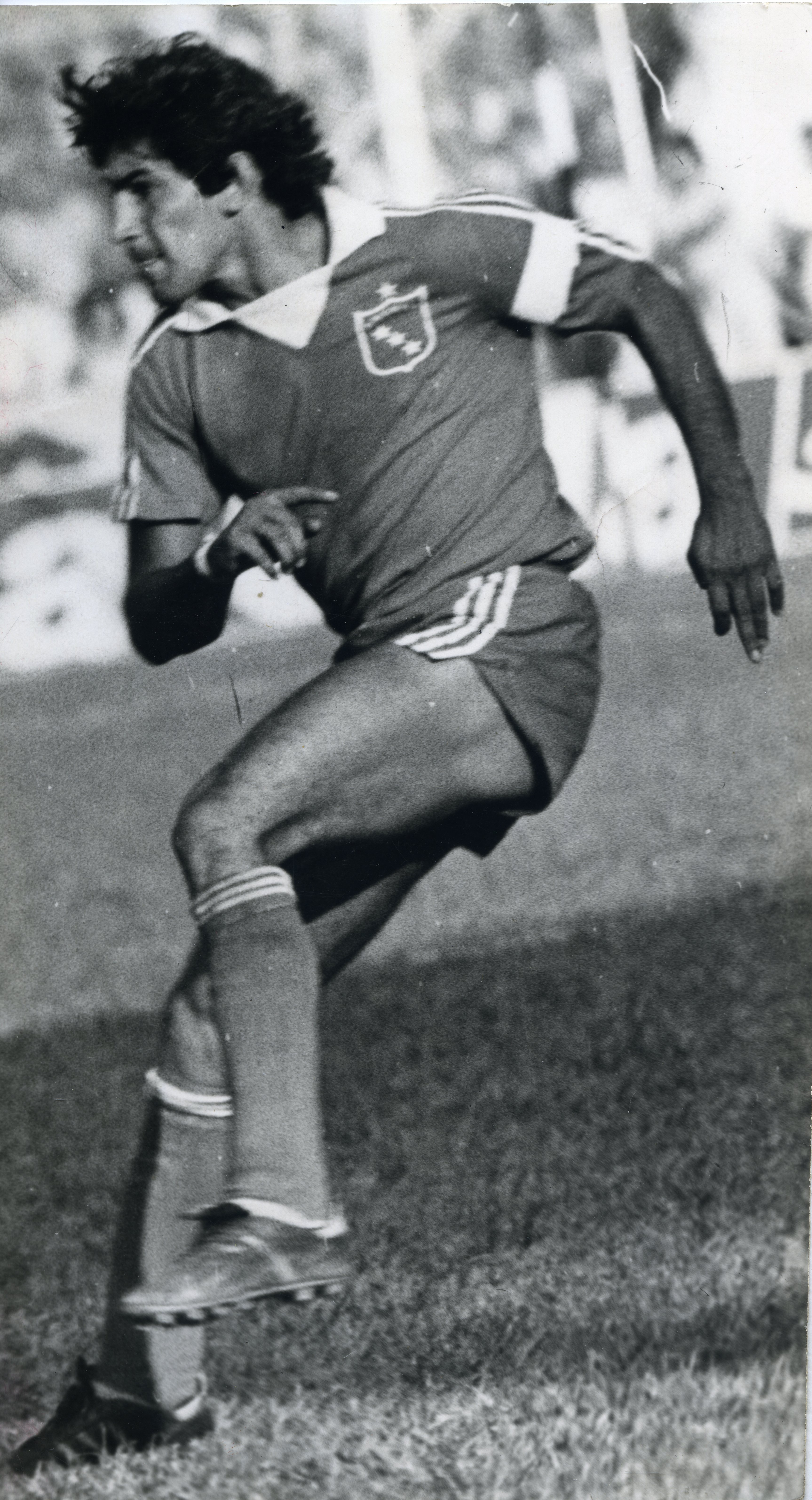 Gerardo González Aquino, nacido en Asunción, Paraguay, este “Guaraní” de temperamento fuerte y con carácter de líder, inició su carrera deportiva en el Nacional de su país. Poco después pasó al siempre grande Cerro Porteño, donde demostró su buen fútbol en las Copa Libertadores de los años 70. Llega al América de Cali, en 1979 debutando en un cuadrangular amistoso contra el Argentinos Juniors de Diego Armando Maradona. Oficialmente debutó el 18 de febrero de ese año frente a Cúcuta Deportivo y finalizó su carrera frente a Atlético Nacional el 21 de diciembre de 1986, después de haber jugado un total de 312 partidos con 16 goles marcados y de haber bordado 6 estrellas en nuestro pecho, 5 de ellas de manera consecutiva. También disputó las finales continentales de 1985 y 1986.Plano entero de Gerardo González Aquino en cancha del estadio Olímpico Pascual Guerrero