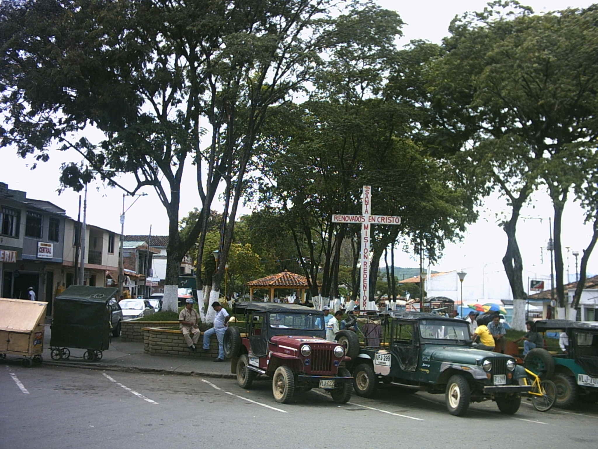 Ansermanuevo, Valle del Cauca. Fundado 15 agosto de 1539, por el Mariscal Jorge Robledo, Se convirtió en municipio por ordenanza 29 de abril de 1925. Observamos el parque principal. Se aprecia los Jeep Willys, la Retreta, las viviendas y las personas