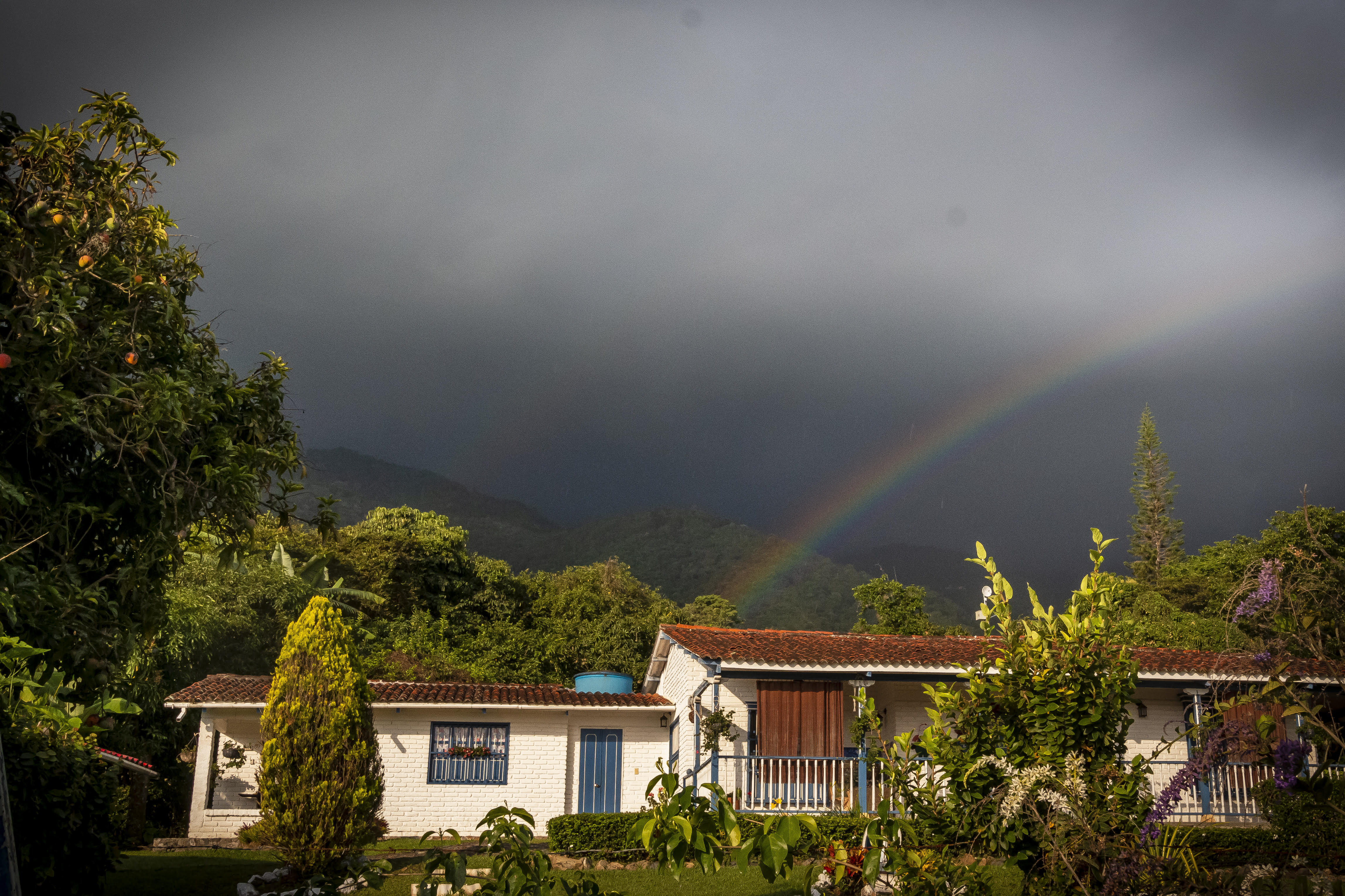 Arcoíris asomándose en la parte trasera de la montaña luego de una gran tormenta.