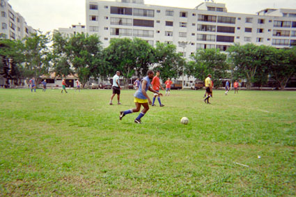 Plano general. Un hombre de raza negra esta jugando fútbol en una cancha con césped. Al fondo algunos árboles y detrás de ellos la fachada de unos edificios conjuros de color blanco.