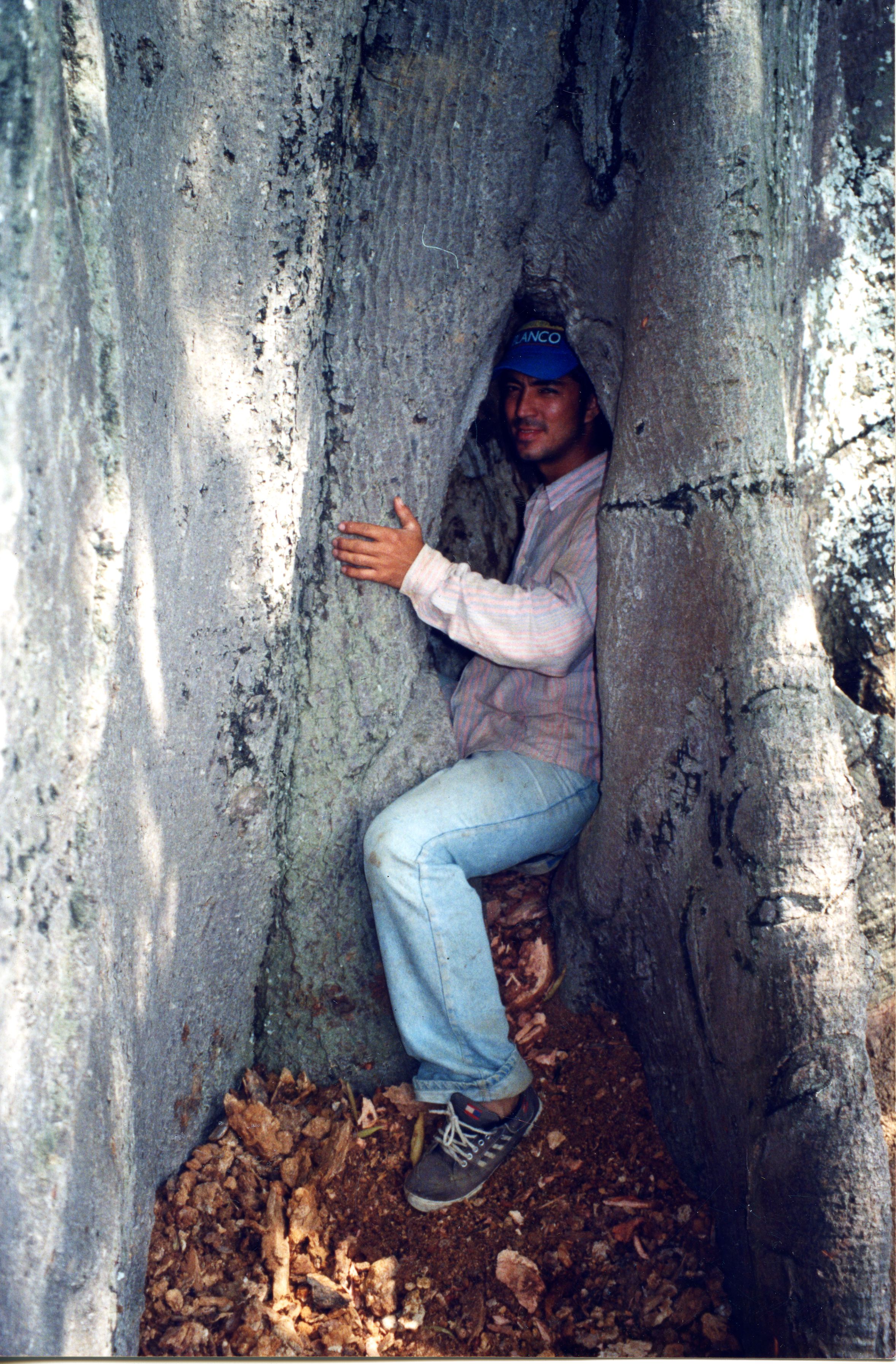Foto de un hombe en medio de la abertura del tronco de una gran ceiba