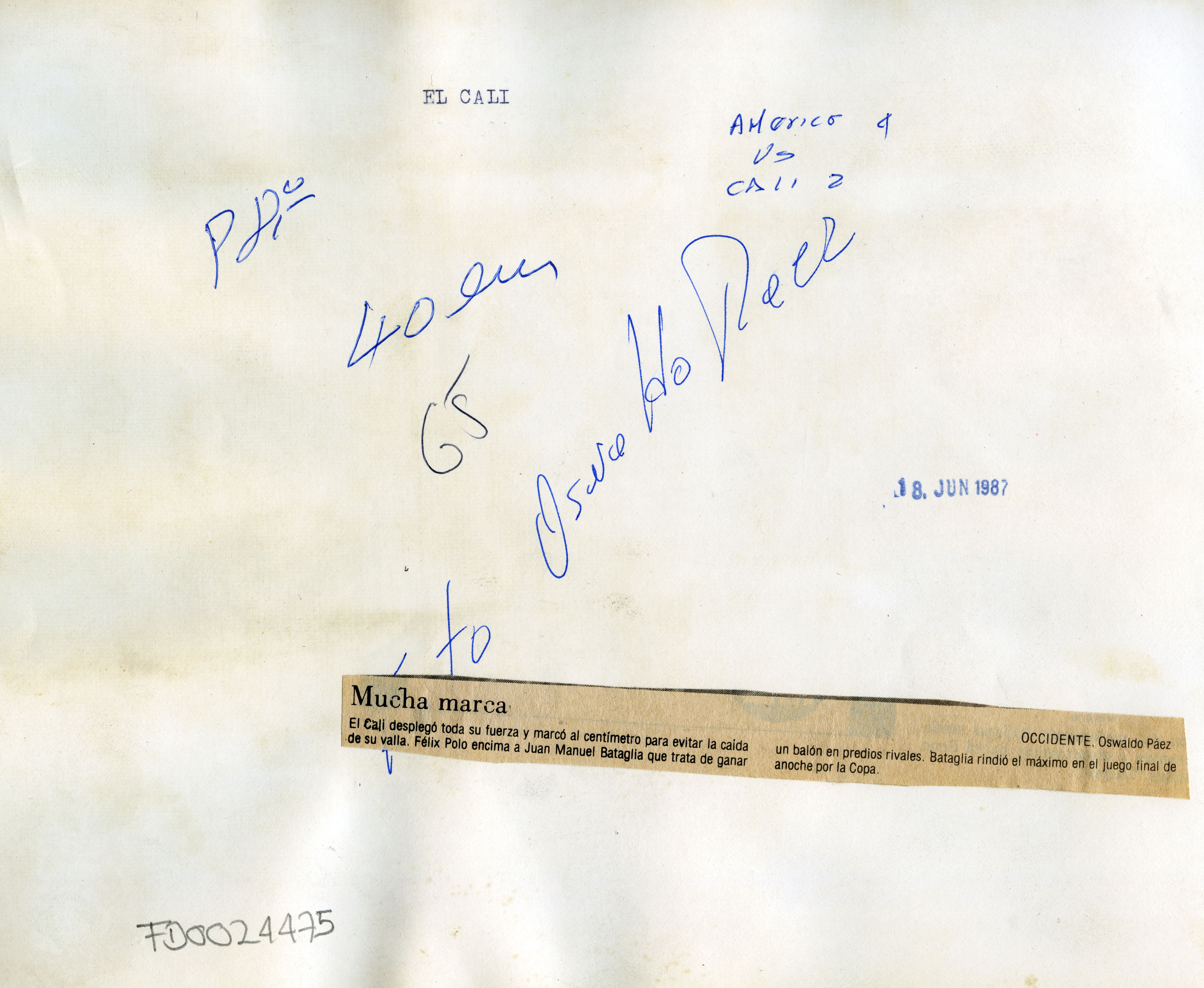 Partido de fútbol entre los equipos América y Deportivo Cali jugado en el estadio Pascual Guerrero. El partido terminó a favor del América 4-2. Se aprecia marca de Polo sobre Battaglia. Observamos público en la tribuna