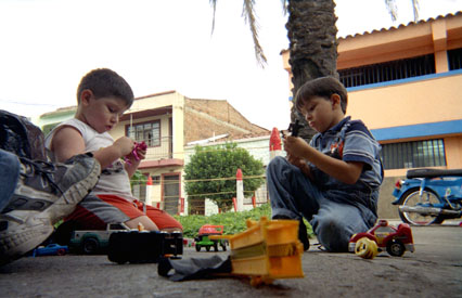 Primer plano. Exterior día. Toma a ras de piso. Primerísimo primer plano de juguetes. Detalle de pie en costado izquierdo.