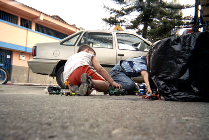 Contraplano. Exterior día. Toma a ras de piso. Niños jugando, junto a carro.