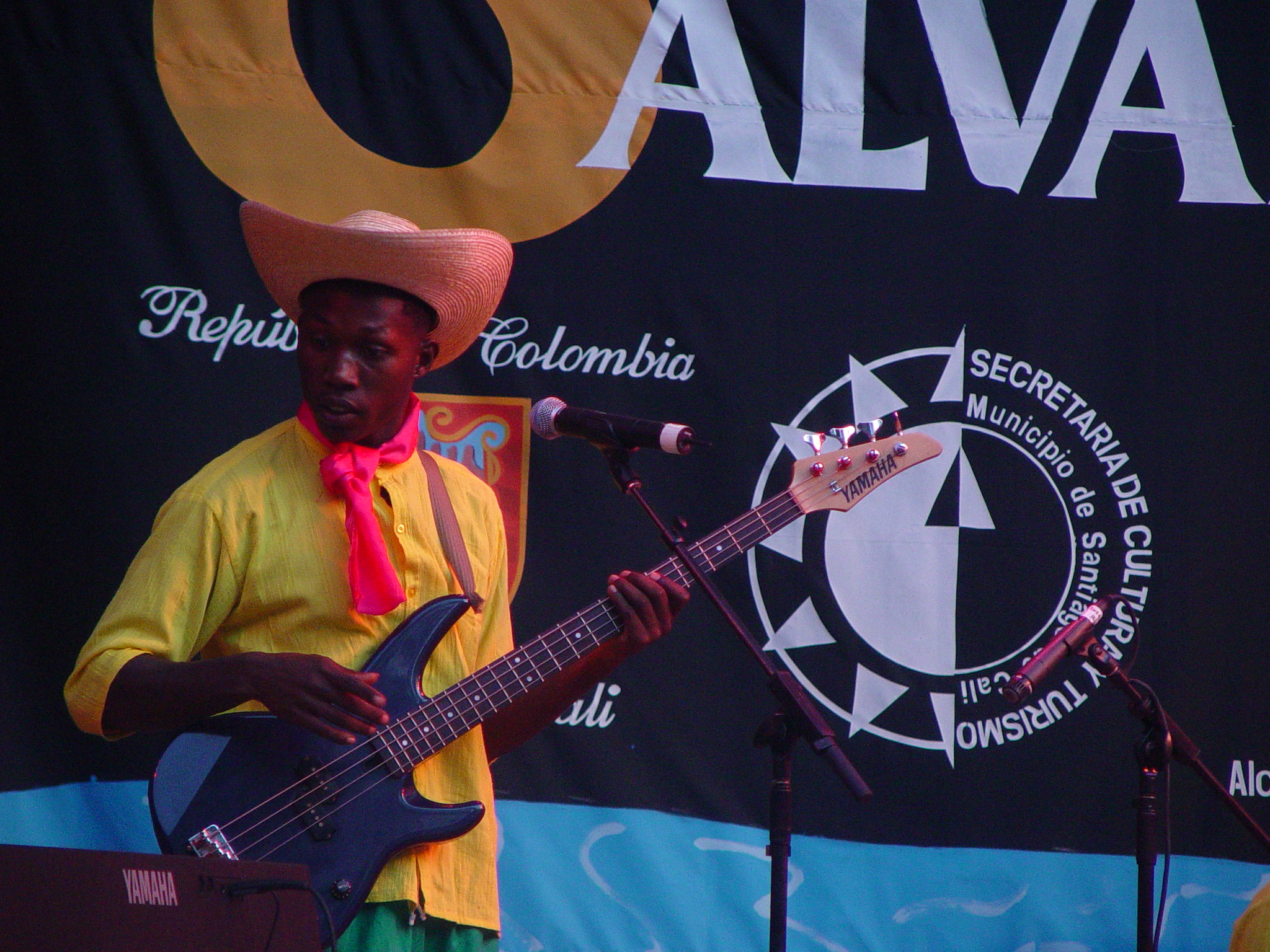 Plano medio de músico tocando el bajo en una presentación musical en el 8 Festival de Música del Pacífico "Petronio Álvarez"