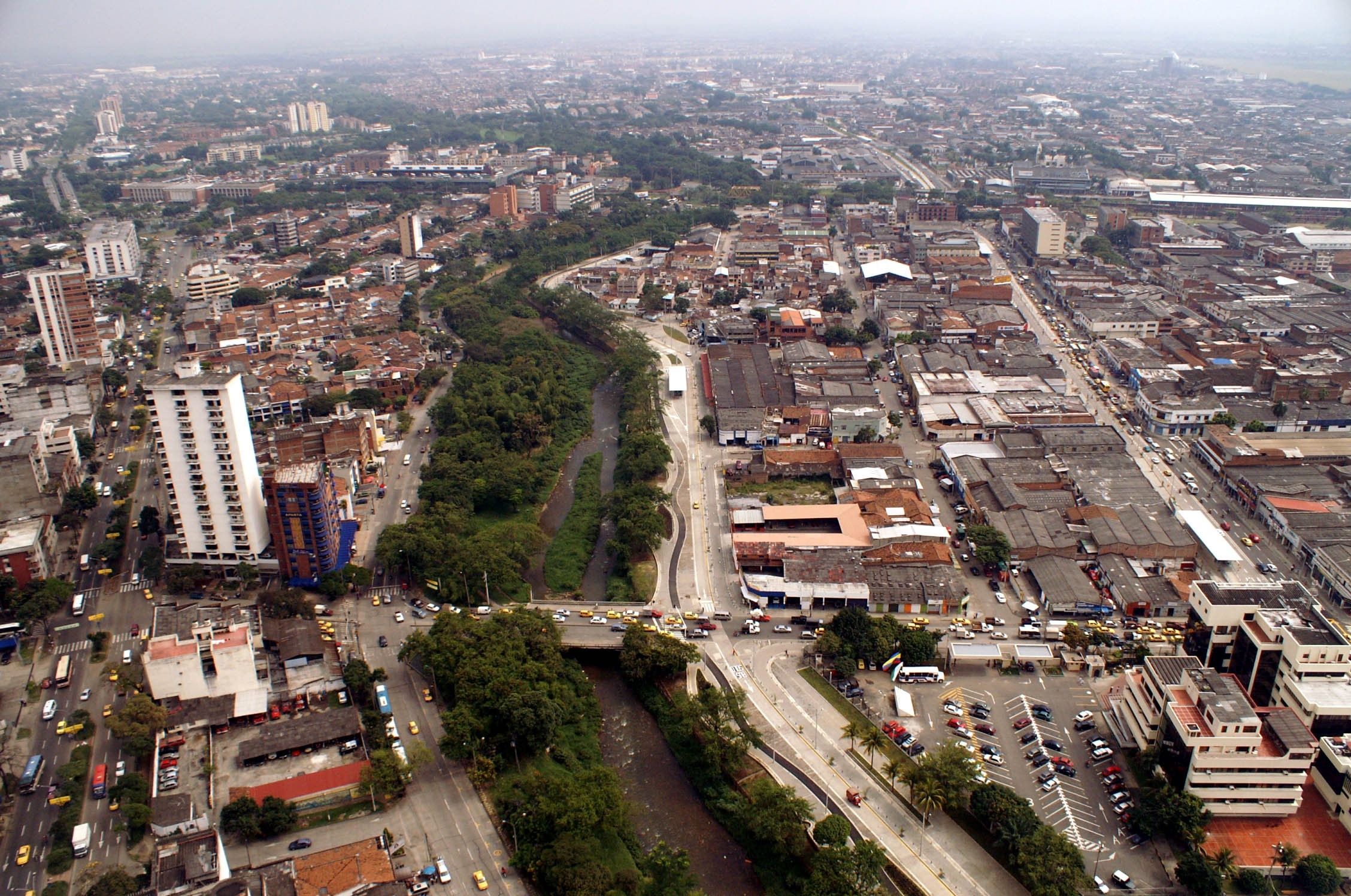 Panorámica de la ciudad de Cali, se pueden observar edificios, autos, avenidas y una zona verde.