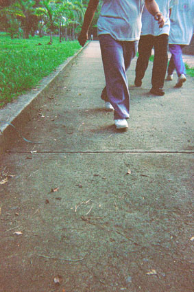 En la imagen tomada en exterior se aprecia un sendero en concreto, por el que transitan algunas personas. Al extremo izquierdo vegetación abundante. Las condiciones de luz son débiles.