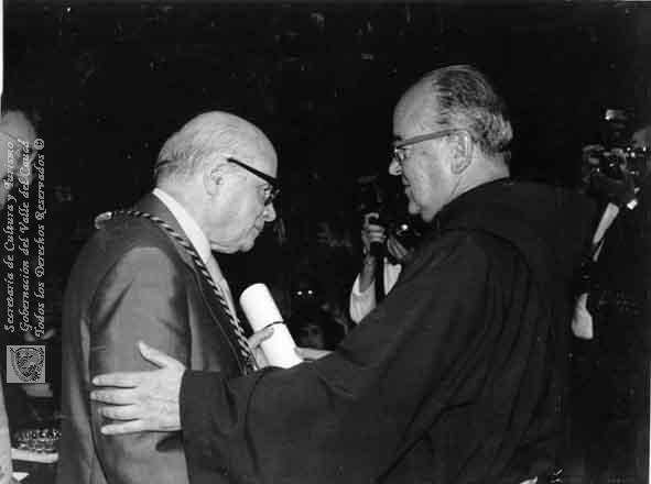 El padre Fray Dario Correa condecoran al expresidente Alberto Lleras Camargo, primer presidente del Frente Nacional. Universidad San Buenaventura. Cali. C. 1973.