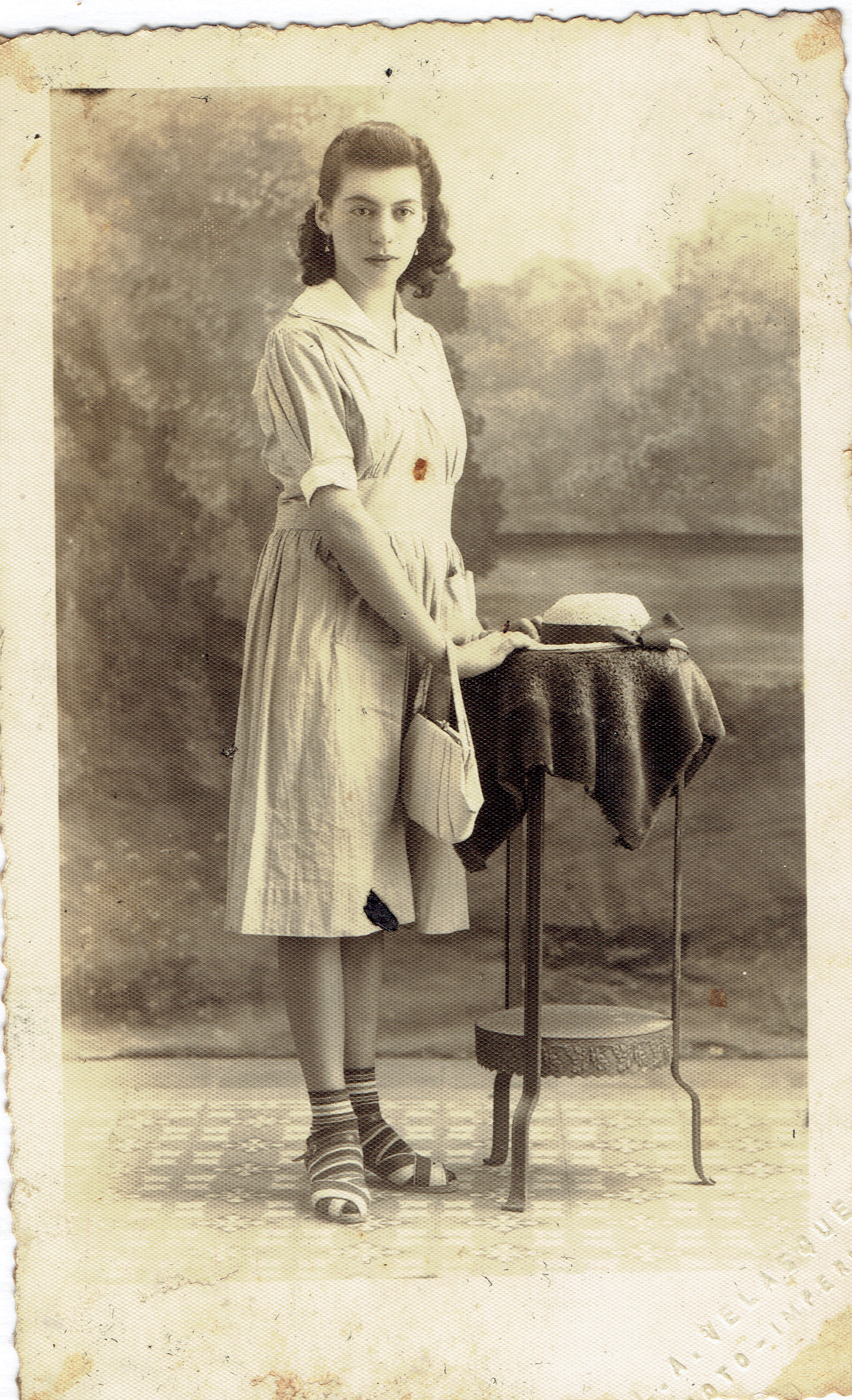 Casa de la familia Cobo. Apreciamos Nohemi Cobo, hija de Avelino Cobo. Observamos mujer de pie junto a una mesa