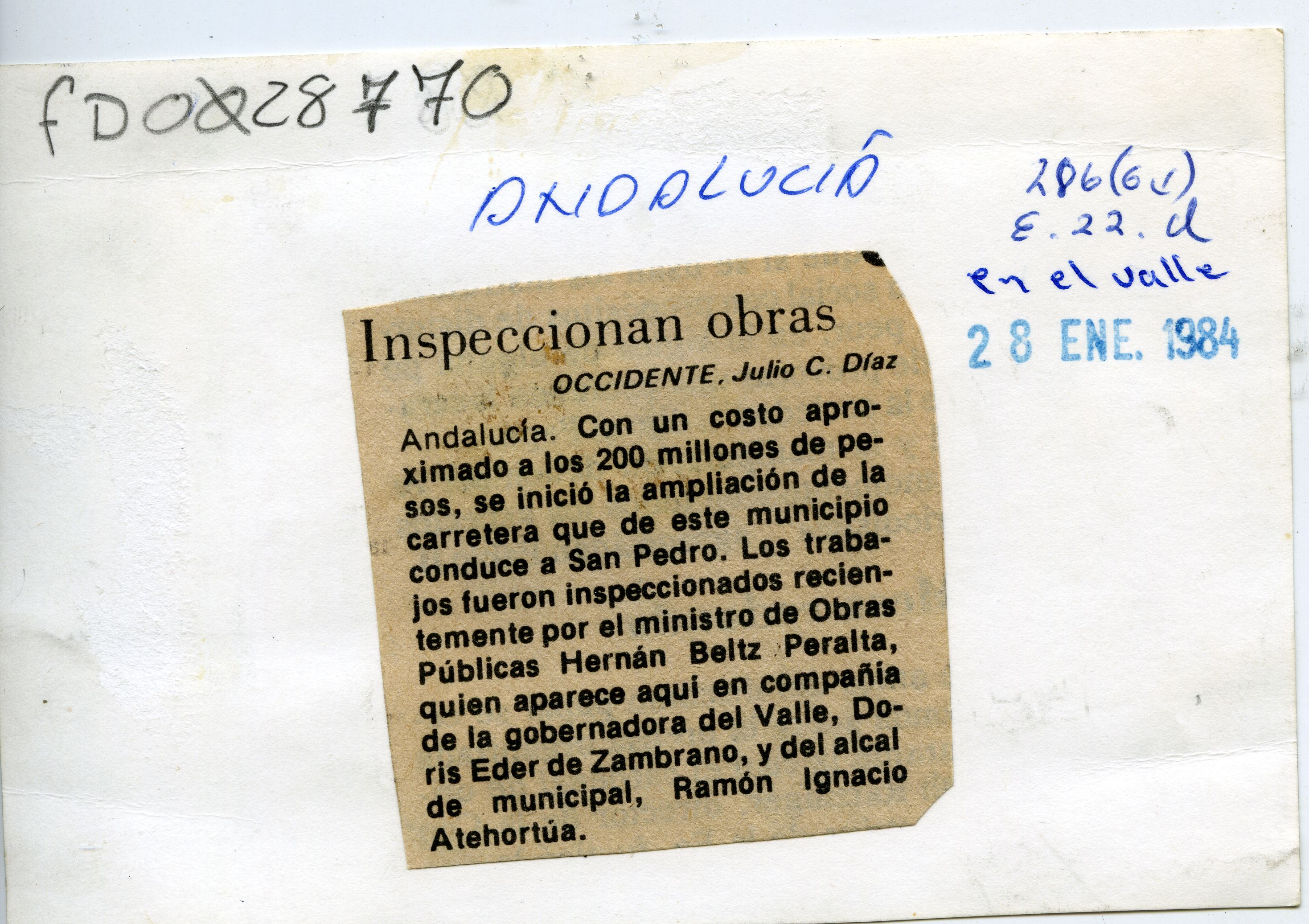 | dc.description.abstract | Reverso:"Inspeccionan obras. Andalucía. Con un costo aproximado a los 200 millones de pesos, se inició la ampliación de la carretera que de este municipio conduce a San Pedro. Los trabajos fueron inspeccionados recientemente por el ministro de Obras Públicas Hernán Beltz Peralta, quien aparece aquí en compañía de la gobernadora del Valle, Doris Eder de Zambrano, y del alcalde municipal, Ramón Cognación Atehortúa." | spa |