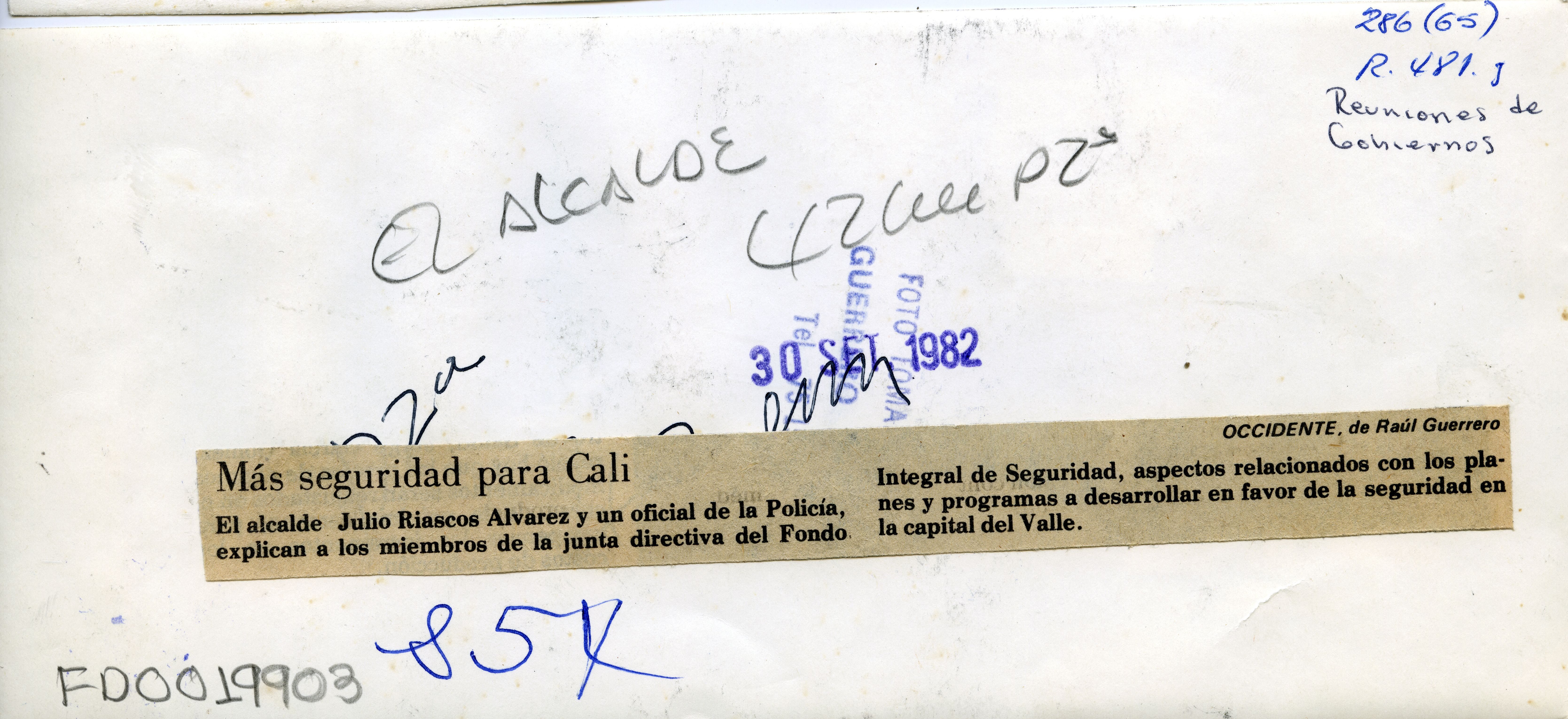 Reverso: El alcalde Julio Riascos Álvarez y un oficial de la Policía, explican a los miembros de la junta directiva del Fondo Integral de Seguridad, aspectos relacionados con los planes y programas a desarrollar en favor de la seguridad en la capital del Valle