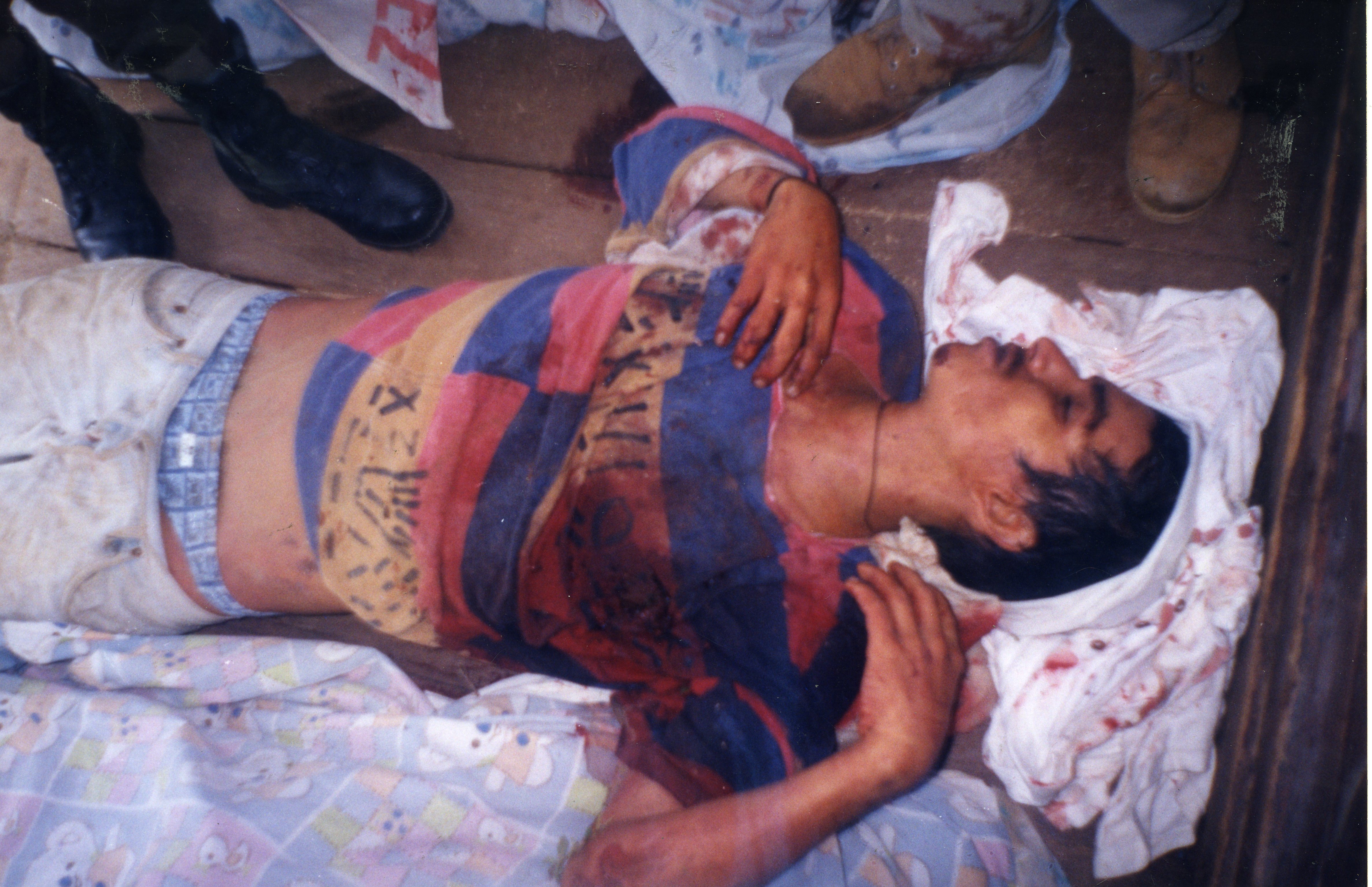 | dc.description.abstract | Hombre tendido en el suelo con su camiseta ensangrentada, víctima de la masacre de El Queremal, corregimiento de Dagua. | spa |