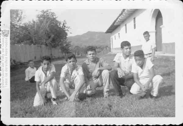grupo de amigos "la gallada" o el "combo" nombre común con se autonombran los grupos de amigos, en esta foto: Pedro Ríos, Germán Londoño, Arnubio (apellido por identificar), Alberto Reyes, Triana (nombre por identificar), Roldán (nombre por identificar), posan al lado norte de la Iglesia San José, prolongación de la calle 3. Obando. 1960.